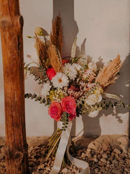 Flowers And Events Recently Teamed Up With An Incredible Group Of Creatives To Arrange A Whimsical Photoshoot At Los Tamarindos. Together We Set Up A Lovely Wedding Day Filled With Gorgeous Details And An Abundance Of Lovely Florals!the Talented Teams From Nabia Weddings And Events And Cabo Weddings And Events Coordinated The Photoshoot On The Beautiful Grounds Of Los Tamarindos. For The Ceremony Flowers And Events Adorned The U-shaped Arch With A Mix Of Palm Tree Leaves, Pampas Grass, And Colorful Blooms For A Modern, Tropical Aesthetic. The Beautiful Bride Held A Bouquet That Mirrored The Style Of The Ceremony Structure.the Contemporary Design Of The Ceremony Setup Carried Over To The Seating Chart Display And The Backdrop For The Reception Lounge Space. Both Featured A Golden Metallic Structure Adorned With Vibrant Florals And Pampas Grass That Matched The Overall Aesthetics. Cabo Rental Decor Provided The Rentals For The Reception. Traditional, White Chairs Were Placed Around Rustic, Dark, Wooden Tables. The Tables Were Set With Stemware And China In Contemporary Black And White Paired With Gold Flatware, White Crochet Chargers, And Napkin Knots In Red And Purple. Flowers And Events Designed The Vibrant Centerpieces That Graced Each Table. The Sweetheart Table Was Set With A Romantic, White Runner Trailing Down The Sides And An Oversized Centerpiece Filled With Gorgeous Blooms In A Wide Variety Of Colors. Scroll Down To See More Photos From This Whimsical Photoshoot At Los Tamarindos Captured By Ernesto Lopez Photographer And Fernanda De La Rosa.