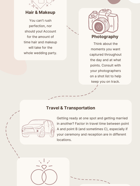 One Of The Most Important Aspects Of Your Wedding Will Most Certainly Be Your Day-of Timeline. An Accurate Timeline Is Key To Your Day Running As Smoothly As Possible. the Ideal Timeline Encompasses All Wedding Activities, Not Just The Start And End Time Of The Wedding Ceremony And Reception. Think About All The Things You'll Be Doing Before You Even Get To The Ceremony: Getting Ready, Taking Pictures, Travel, Are All Things That Should Be Accounted For On Your Timeline. this Helpful Infographic Highlights Some Key Areas Of Your Wedding Day That Will Impact Your Timeline:hair And Make-up: The Wedding Party's Hair And Makeup Service Should Have A Schedule That Is Incorporated Into Your Overall Timeline. Make Sure You Note What Time The Hair And Makeup Artists Are Arriving, Their Set-up Time, And How Much Time They Require For Each Service. If The Wedding Party Is Going Off-site For Hair And Makeup, Take Into Consideration Travel Time To And From The Salon/studio So That Everyone Has Enough Time To Get Dressed After Hair And Makeup.photography: When Mapping Out Your Day, Make Sure You Have Enough Time To Get All Of The Shots You'd Like Your Photographer To Capture. Consider Whether You Want To Take Photos Before The Ceremony, And Make Sure You Build Enough Photo Time In Your Timeline. Consult With Your Photographer On Your Shot List And Be Sure To Clearly Communicate Your Expectations About What You'd Like Covered So The Photographer Can Ensure There's Enough Time As Well.travel And Transportation: Make Sure You Factor In Any Travel Taking Place On Your Wedding Day. Will You Be Getting Ready At A Different Location From The Ceremony? Will You Be Traveling From The Ceremony To A Different Location For The Reception? Will You Be Traveling Off-site To Take Photos? Any Travel Should Be Timed And Documented On Your Timeline, Giving Yourself Cushion Time Is Highly Recommended. If You're Providing Shuttle Service For Your Guests At Any Point, Make Sure You Schedule Enough Time For The Guests To Arrive On Time To Their Destination. ceremony Length: Most Non-denominational Ceremonies Last Around 30 Minutes, While Religious Ceremonies Can Vary Anywhere From 45 Minutes To An Hour. Make Sure To Account For The Right Amount Of Time For Your Ceremony To Make Sure That You Don't Cut Other Events I.e. Your Cocktail Hour, Or Transportation Time If Guests Are Going To A Different Location For The Reception.reception Activities: When Mapping Out Your Timeline, Make Sure You Take Note Of All Activities Including Introductions, Cake-cutting Blessings, Speeches, Dances, Special Performances, Etc. Be Sure To Consult With The Caterer To Ensure That Your Reception Activities Algin With The Timing Of Dinner Service So That The Evening Flows Smoothly For You And Your Guests. mapping Out Your Whole Day From Beginning To End, Will Give You Peace Of Mind On Your Wedding Day, And Will Help Your Vendor Team Stay On Track To Ensure You Have A Memorable Wedding Day!