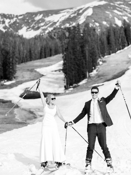 Ahhh, Summertime In The Rockies. There's Not Much Like It! Rolling Green Mountains, Pines And Aspen Trees Swaying In The Wind, Rushing Waterfalls, Hikers And Mountain Bikers, And....skiers?! In June?? June 29th, To Be Exact. We Always Say, If You Don't Like The Weather In Colorado, Wait 20 Minutes. Well, When Kendall + Dusty Picked Their End Of June Summertime Wedding At The Top Of Arapahoe Basin, Snow Was The Last Thing We Thought We'd Have To Deal With. Boy, Were We Wrong! Mother Nature Had A Different Idea For The Week Of Their Mountaintop Wedding And The Snow Poured Down. We Were In Constant Communication With Our Couple And The Venue And The Risk Of Postponement Was On The Horizon. Thankfully, The Storm Came And Went And Left Behind A Few Feet Of Fresh Powder - Which Now Posed A New Challenge - The Mountain Would Be Open For Skiing On Their Wedding Day.in Normal Summer Weather, The Mountain Would Be Closed For Skiing And We Would Have The Lodge Staff Drive Up Our Vendor Teams And Decor On Snow Cats (super Duty Snow Mobiles) While Guests Enjoyed A Leisurely Ride On An Empty Chair Lift To The Top. With An Active Ski Run That Day, The Plans Had To Change. What Was A New Set Of Challenges To Get Everything We Needed To The Top Of The Mountain (trust Me, Summer Road Is A Very Loose Term Being Thrown Around For Our Commute To The Top!), Turned Into An Epic Day To Remember And An Opportunity For Our Newlyweds That Very Few Will Ever Experience.kendall And Dusty's Mountain Rustic-chic Wedding Was One For A Skier's Fairy Tale. Personal Touches Included Hand-carved Aspen Tree Place Card And Table Number Holders - The Table Numbers Were Vintage Mountain Post Cards - A Cool Cowhide Adorned The Ceremony Space, Surrounded By Aspen Trunks And Overflowing Flower Arrangements, And Soft Tan Leather Straps Hung Tiny Bouquets From The Rows Of Chairs. Hints Of Antlers Made Their Way Into The Decor - Befitting A Groom With The Last Name Buck. After The Couple Said Their I Do's, The Two Slipped Off Their Dress Shoes And Buckled Into Their Ski Boots For The Most Memorable Recessional We've Ever Seen. They Took Their Time As They Skied Hand-in-hand Down The Now Closed Ski Run. They Must Have Felt Like The Only Two People In The World For Those Moments. Kendall Said, It Gave Us An Opportunity To Reflect On Our New Marriage And Take In This Incredible High We Were Feeling. It Was Really Special To Have This Time For Just The Two Of Us.with A Kiss At The Bottom And Another Ride Back Up The Chair Lift, The Party Was On. They Celebrated The Rest Of The Evening Surrounded By Friends, Family, And Loved Ones Who Had Traveled To The Top Of The World To See Them Wed. They Danced All Night With The Band, Shared Cake And Cocktails, And Tried To Take It All In. Kendall And Dusty Certainly Rolled With The Punches In The Days Leading Up To Their Wedding And Their Patience Paid Off. It Just Goes To Show That Sometimes Our Plans Can Change And Sometimes They Change For The Better.