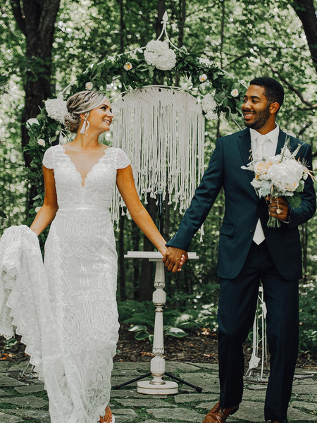 When Maurice Met Sarah At Iowa State University, It Took Barely A Glance For Sarah To Know He Was The Real Deal. In Fact, Within 24 Hours, She Was Smitten. Through The Highs And Lows Of A Long-distance Relationship, From That Point On, Sarah And Maurice Only Had Eyes For Each Other. On A Historic Pedestrian Bridge Overlooking The Minneapolis Skyline, Maurice Got Down On One Knee And Asked Sarah The Best Question She Had Ever Heard!they Had Always Wanted A Smaller More Intimate Wedding So A Semi-destination Style Wedding Seemed Their Best Option. Southwest Michigan Was Far Enough Where We Felt We Could Keep Our Guest List At A More Reasonable Number But Close Enough Where Family And Friends Could Afford To Travel And Stay. They Fell In Love With Stonegate Manor Because Of The Beautiful Setting, Especially The Fairy Garden Where They Held Their Ceremony. The Fact The Reception Area Was Both Indoors And Outdoors So Their Families Could Be Comfortable And Enjoy Both Was A Real Plus. And Prudy, The Manager, Was Quick With Communication Which Was So Important Planning From Afar And In Only A Few Months.while They Didn’t Have A Theme And Weren’t Really Focused On A Style, Their Choices Just Naturally Fit Into A Bohemian Vibe. Being Very Laid Back, Both Just Wanted A Big Party With All Of Their Favorite People There…which Is Exactly What They Got! sarah’s Beautiful Dress Was From Zavana, An Australian Brand. Known For Their Exquisite Lace Designs, Intricate Beading And Beautiful Details, Sarah’s Dress Did Not Disappoint. With 2 Unique And Distinct Lace Patterns It Perfectly Embraced Both Elegance And A More Casual Boho Feel. And It Fit Perfectly…no Bride Could Have Been More Beautiful!!!the Bridesmaids Were Uniquely And Beautifully Dressed In Rust/coral Jumpsuits That Added A Casual But Elegant Flair. Coupled With The Men’s Navy-blue Suits, It Was An Absolutely Stunning Color Combination.the Boho Theme Was Also Reflected In Their Choice Of Decoration For The Wedding Arch…a Hand-made Macramé “curtain”. Truly A One-of-a-kind Touch And Fit In So Nicely With More Casual Lace Featured In Sarah’s Dress.the Best Thing About Their Wedding? Maurice And Sarah Enjoyed Everything About It But They Did One Thing That Was Especially Meaningful. They Took About 20 Minutes After The Ceremony And Before The Reception To Enjoy A Glass Of Champagne, Just The Two Of Them, Before Joining The Rest Of Their Family And Friends. It Gave Them Time To Reflect And Soak In The Fact That They Were Finally, Really And Truly, Married. when Asked About Working With Vendors, They Advise Being Very Clear About Your Expectations From The Beginning. Communication, Communication, Communication Is Imperative To Avoid Confusion As You Get Closer To Your Wedding Day. Get All Your Questions Asked And Answered So You Are Feeling At Ease When The Day Finally Arrives. And Sarah Recommends Getting A Wedding Planner….”some Of Our Best Money Spent!”simply The Best Day Ever!
