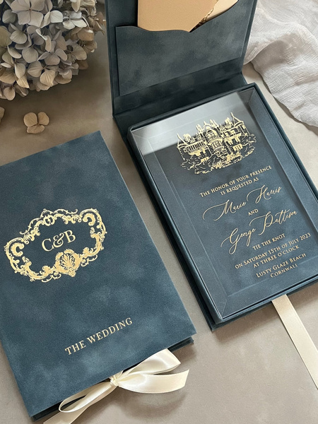 These Luxury Wedding Invitations In Velvet Boxes Seamlessly Blend Timeless Aesthetics With Modern Technology. The Invitation Kit Consists Of A Velvet Box Adorned With A Foil-stamped Monogram And An Acrylic Invitation Foil-stamped With Elegant Design. Browse Gallery Below Or Visit Our Website For More Luxury Wedding Invitations Designs.