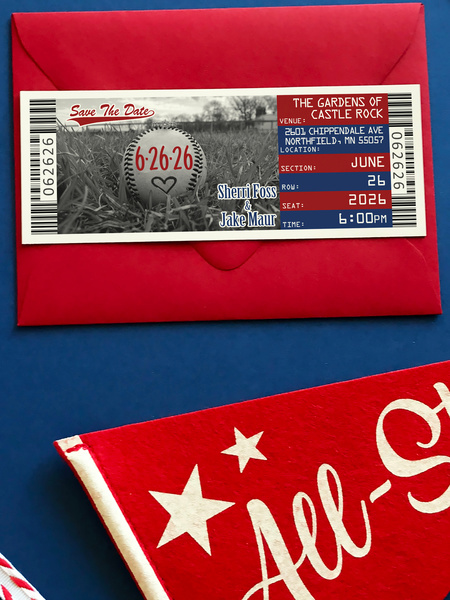 These Are The Perfect Fit For Your Baseball Or Other Sport Themed Wedding. Make Your Save The Dates Fit Your Theme By Announcing Your Wedding With Tickets! These Are Available As Either Tickets Printed On Ticket Stock Or A Magnet. The Colors On Your Tickets Will Be Changed To Match Your Wedding Colors Or Your Favorite Team's Official Colors. The Example Shown Is A Favorite Of Baseball Fans Of All Kinds. The Ticket's Colors Can Be Changed To Match Your Favorite Team's Colors.