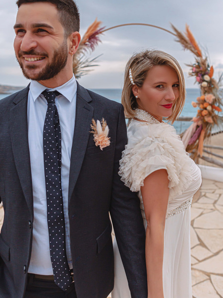 Ibiza, The White Island, Is The Perfect Setting For This Romantic Elopement With Beach Boho Vibes.we Are In Cala Tarida, One Of The Most Beautiful Spots On The Island In Cas Mila, A Beach Restaurant With A Stunning View Over The Sea.a Cloudy Day Transformed The Light Of The Sky Into A Painting, Giving The New Couple Unique Emotions. Look At This Circular Arch To Symbolize Infinity !!the Mise En Place Of The Reception On A Wooden Table With A Romantic Cake In Perfect Boho Style.and Here We Are, Finally The Newlyweds As Two Dancers, In The Full Ibizan Spirit, Giving Us All The Passion And Joy Of Their Love, Thanks To The Wonderful Shots Of The Photographer Alan Who Captured All The Beauty Of This Sparkling Couple.