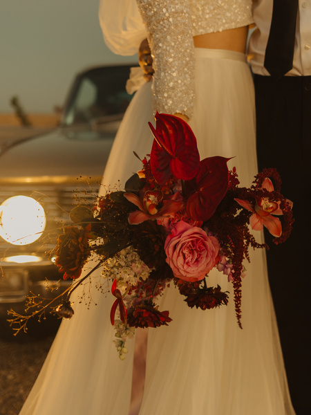 At The End Of The Day, It's All About Who You Want To Ride Off Into The Sunset With. Boise's Lovely Desert Scape At Sunset Was Just Perfect For This Retro Chic Elopement Shoot. Moody Florals From Wayward Greens, This Stunning Sequin Top And A Classic Cadillac Were Just A Few Of The Details That Brought It All Together. Madeline Rose Photography Captured The Mood Just Right!