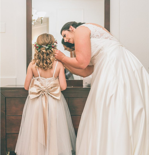 But not only did the bride and groom looked amazing, their flower girls looked amazing too! These two little ladies were cute enough to steal the show – almost! Their beautiful free-flowing ivory dresses were paired with simple floral crowns and white sandals. The dresses are from our collection of flower girl dresses. And this design is one of our best sellers! This dress beautifully blends rich fabrics like tulle and lace and elegant, oh-so-pretty design features V neckline, lace bodice with spaghetti straps and gorgeous tulle skirt in a knee length. Thin beaded sash at the waist completes the whole look.