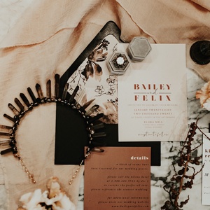 This sleek and modern styled wedding shoot combines edgy with traditional wedding vibes in the most perfect way. The bride's gown 'Ibiza' by ELAVONZA Bridal gets paired with tulle wings for something non-traditional, as well as a black crystal headpiece to make a statement. The mood was dark romantic, with plenty of florals in deep warm colours and an invitation suite that will have you OBSESSED. Browse through this gallery to get tons of inspiration for a modern, sleek wedding styling look!