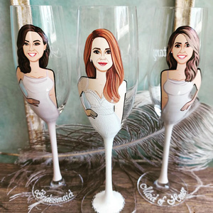 You will definitely want to say - thanks for being together, thank you for your support and care. Personalized gift will say it all. Customized champagne and wine glasses can be perfect “Will you be my bridesmaid?” gift. You can use them in your Bridal Party and reception as eye catching decoration.I’m artist and I’m painting illustrations on glasses. Each glass is unique painting by likeness, I will use your photos to make a very special gift for each Bridesmaid , Maid of Honor and Mother. I will make pretty illustrations including customized dresses and bouquets. And yes, you can drink form these glasses and wash them.If you are interested – please contact me and I will make these fully customized gifts for you.