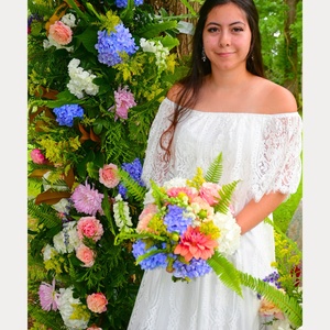(Bottom) Our bride, Natalie, looks beautiful in her off-the-shoulder, lace dress. Her bouquet features dahlia, hydrangea, roses, and fern.