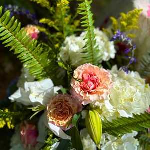 (Below) A white, painted metal urn contains lilies, fern leaves, hydrangeas, and garden roses.
