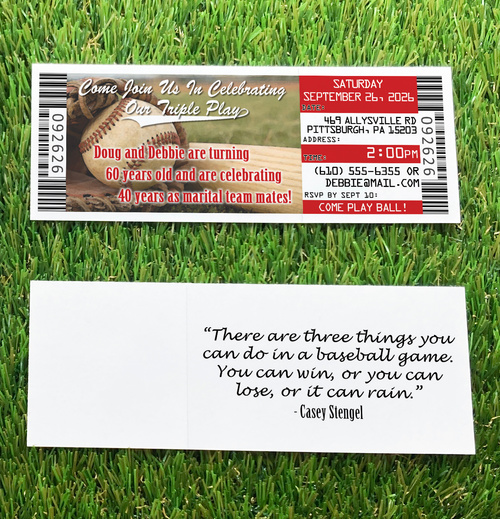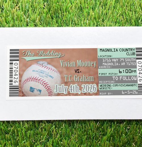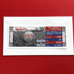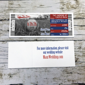 These are the perfect fit for your Baseball or other Sport Themed Wedding. Make your Save the Dates fit your theme by announcing your wedding with tickets! These are available as either tickets printed on ticket stock or a magnet. The colors on your tickets will be changed to match your wedding colors or your favorite team's official colors. The example shown is a favorite of baseball fans of all kinds. The ticket's colors can be changed to match your favorite team's colors.