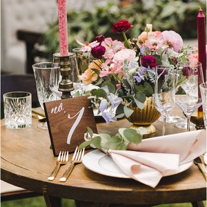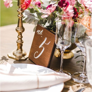 Gold holders for paper table numbers with blush and white florals surrounded by greenery.