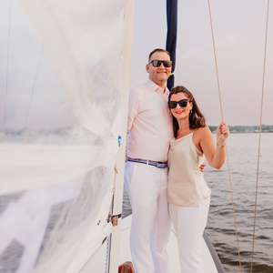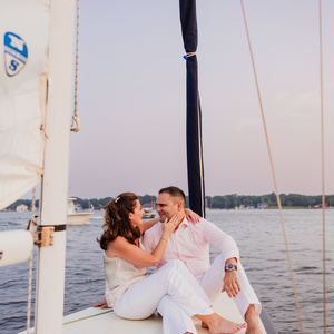 Their engagement session brought excitement and challenges. The excitement? A stunning sunset with just the right amount of breeze. The challenge? A haze from the Canadian wildfires. But the photos turned out beautiful for this perfect sailboat engagement session.