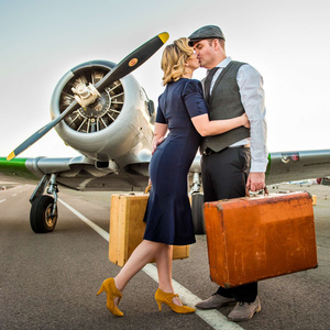 Emily and Rafael’s 1940’s attire, hair, and makeup made the photos feel like a step back in time. Also, the suitcases (pictured below) were gifted to Emily’s grandmother on her own wedding day… 60 years ago! Check out the amazing photos from this fun and glamorous engagement photo shoot :)