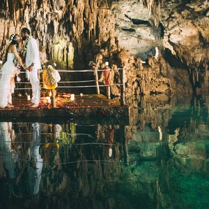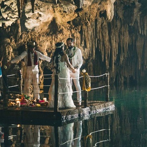 The couple decided on this wonderful location near Tulum for their traditional Mayan wedding ceremony, cenote with cave and floating platform for the ceremony.