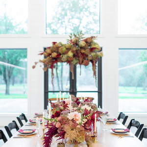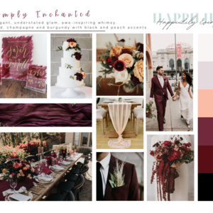The vision was brought to life by taking traditional elements and giving them a more colorful and whimsical feel. We wanted “guests” to feel enchanted! Our primary color palette relied on burgundy and black tones, which contrasted perfectly with the venue’s light & bright space. We also added poppy peach accents through the floral arrangements and tablescape.