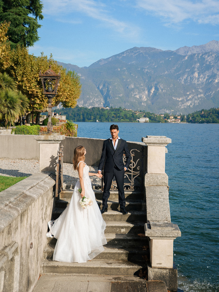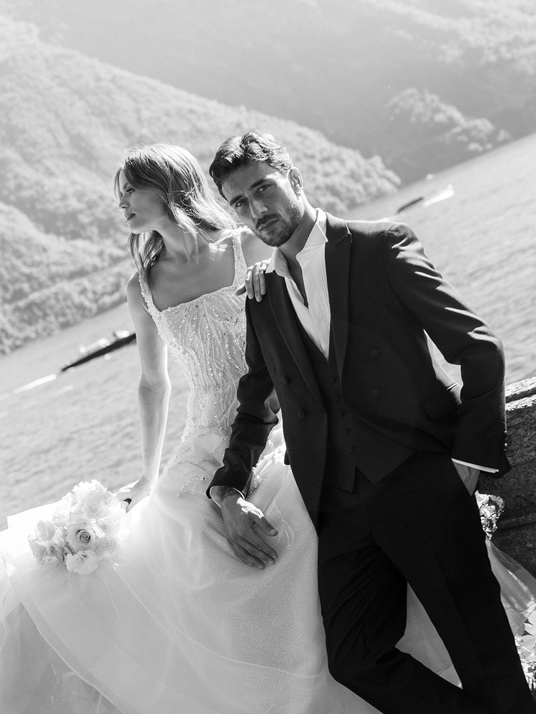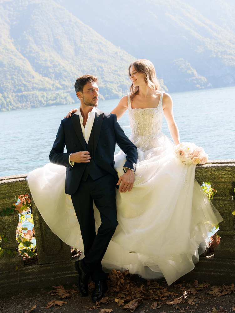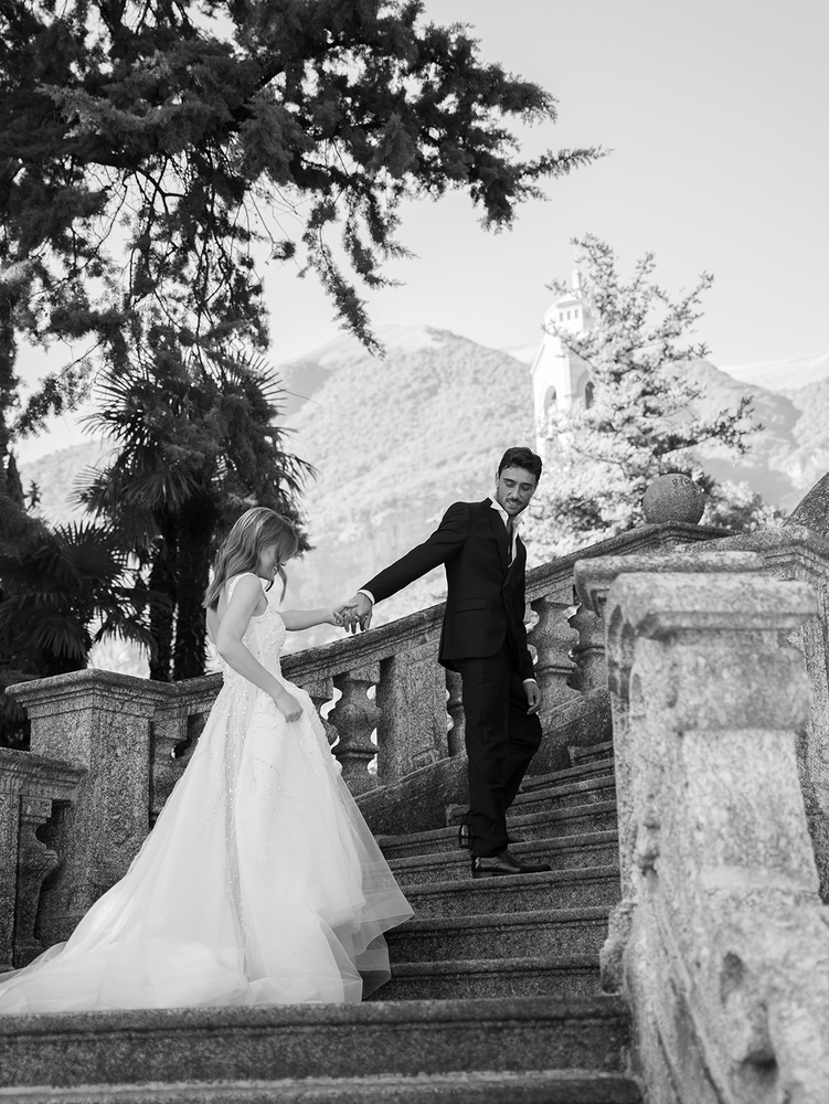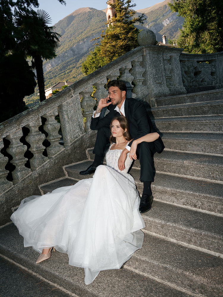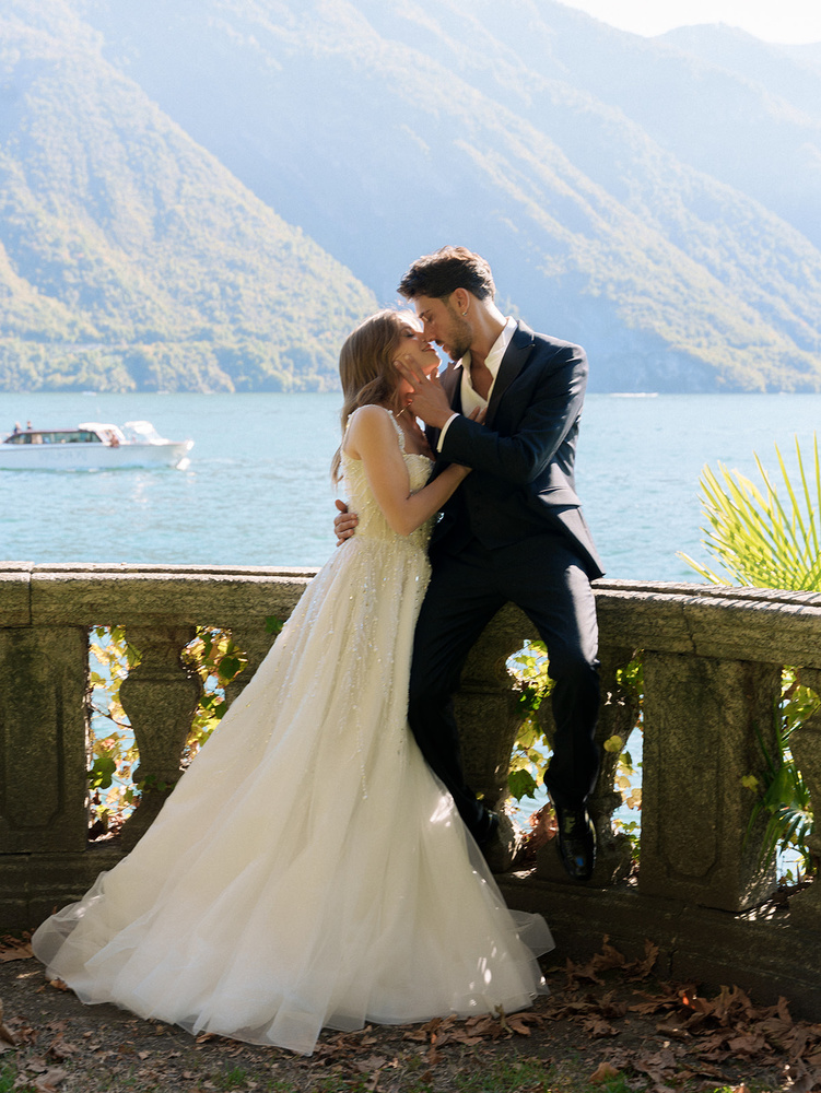 Framed by sculpted gardens and historic stone terraces, every moment captures the quiet grandeur that defines Italian romance.The vision was to create an atmosphere where elegance feels natural, and emotion feels unguarded. The bride’s gown, adorned with delicate sparkle, flows with poetic movement against the lake’s stillness, while the groom’s presence adds balance and depth — a portrait of connection and grace.
