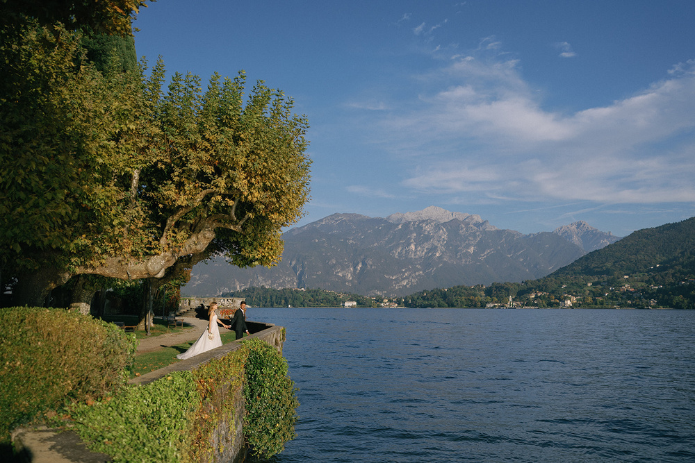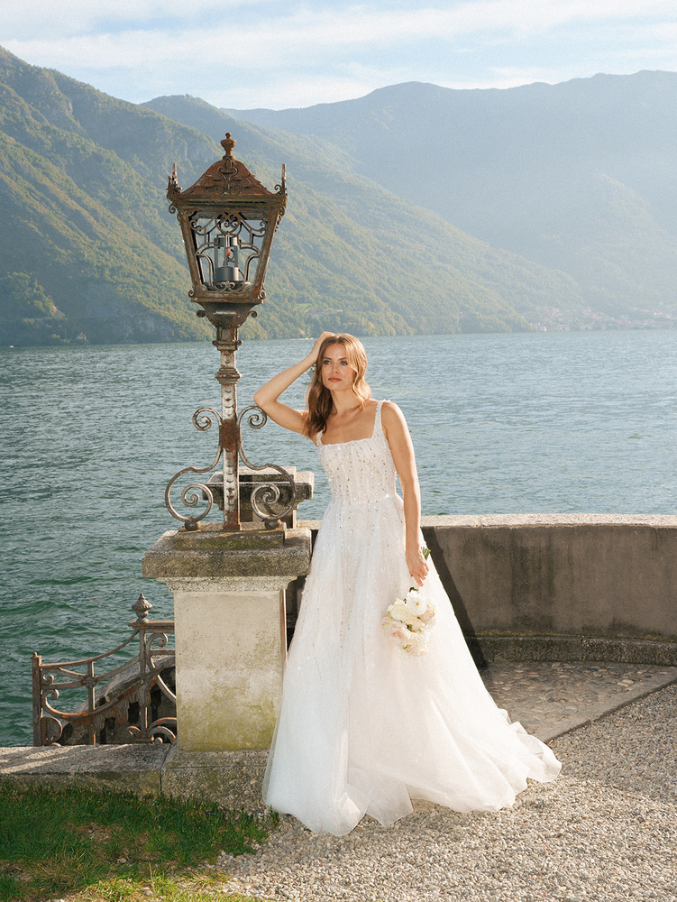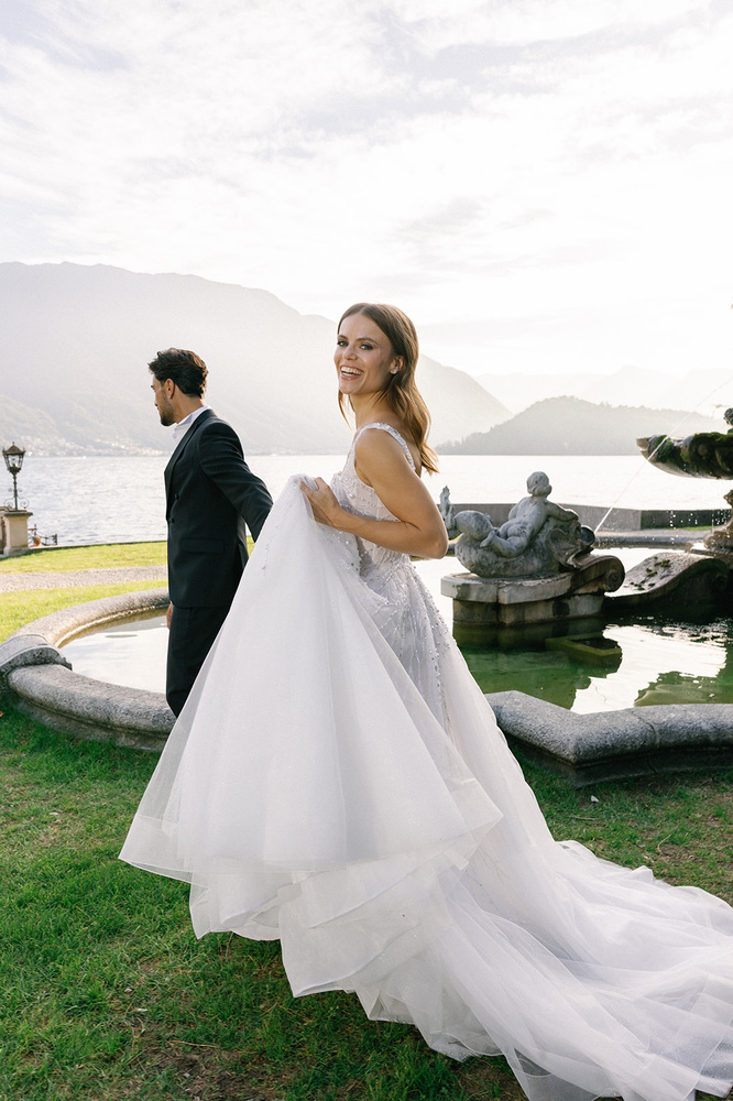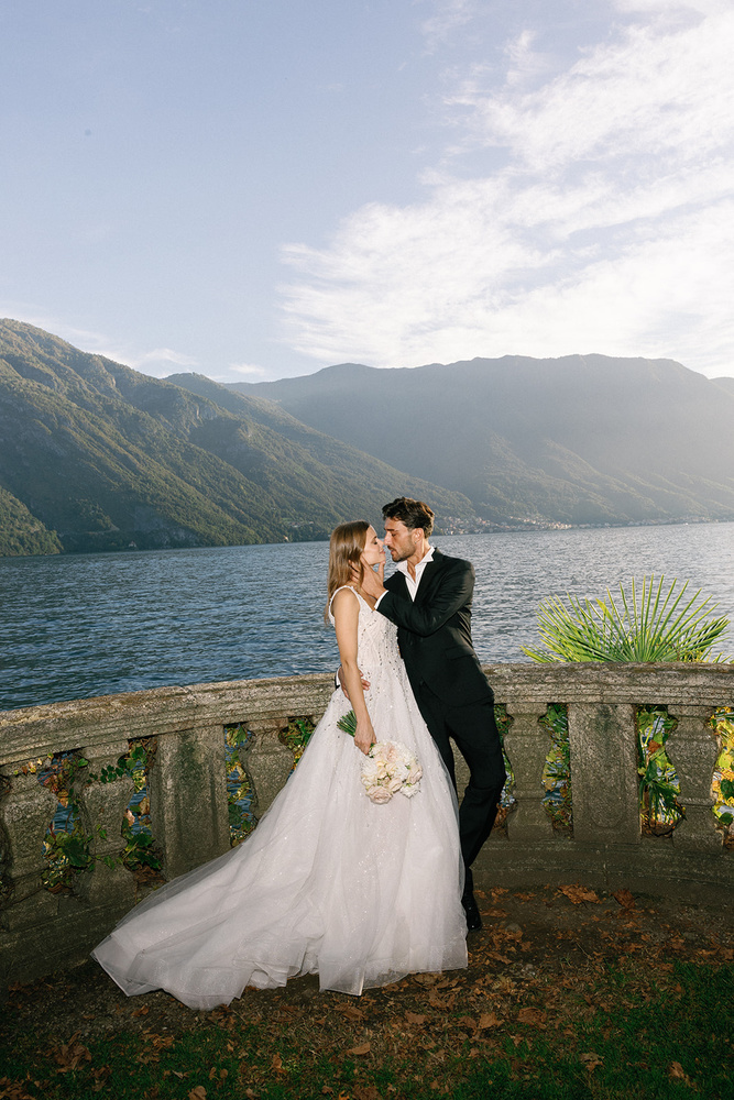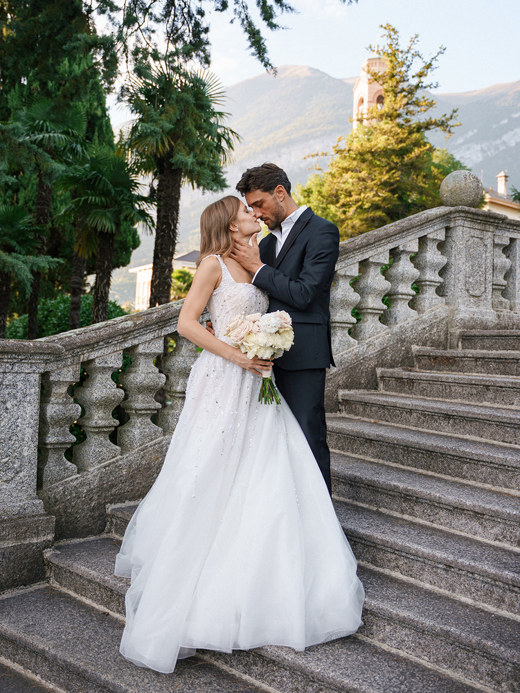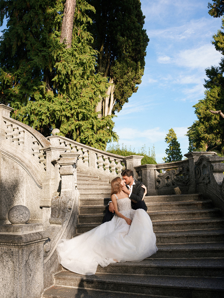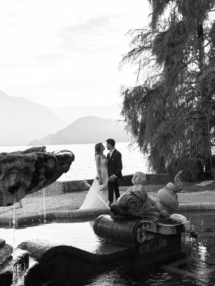 Framed by sculpted gardens and historic stone terraces, every moment captures the quiet grandeur that defines Italian romance.The vision was to create an atmosphere where elegance feels natural, and emotion feels unguarded. The bride’s gown, adorned with delicate sparkle, flows with poetic movement against the lake’s stillness, while the groom’s presence adds balance and depth — a portrait of connection and grace.