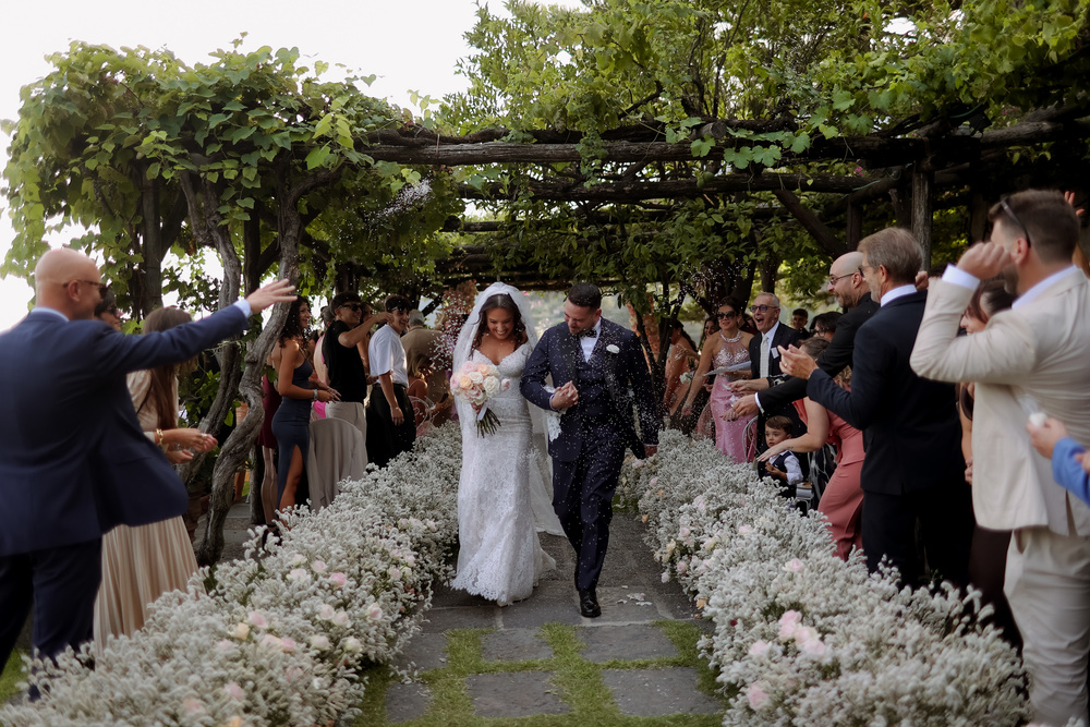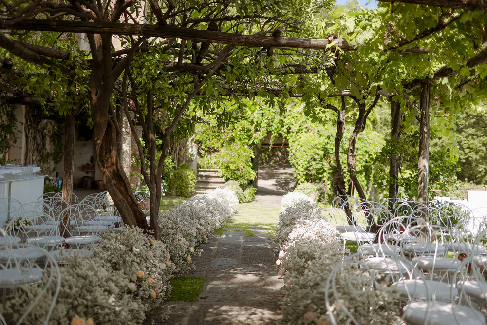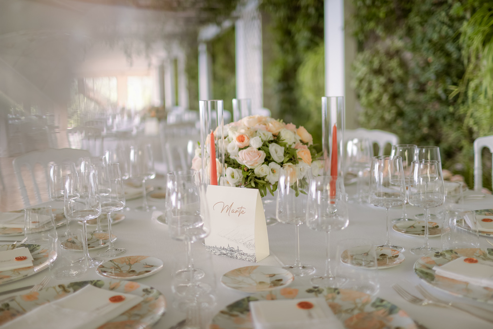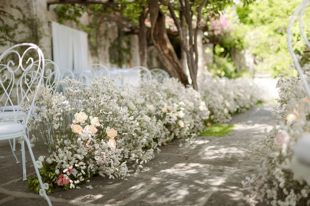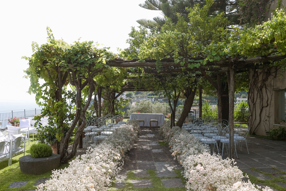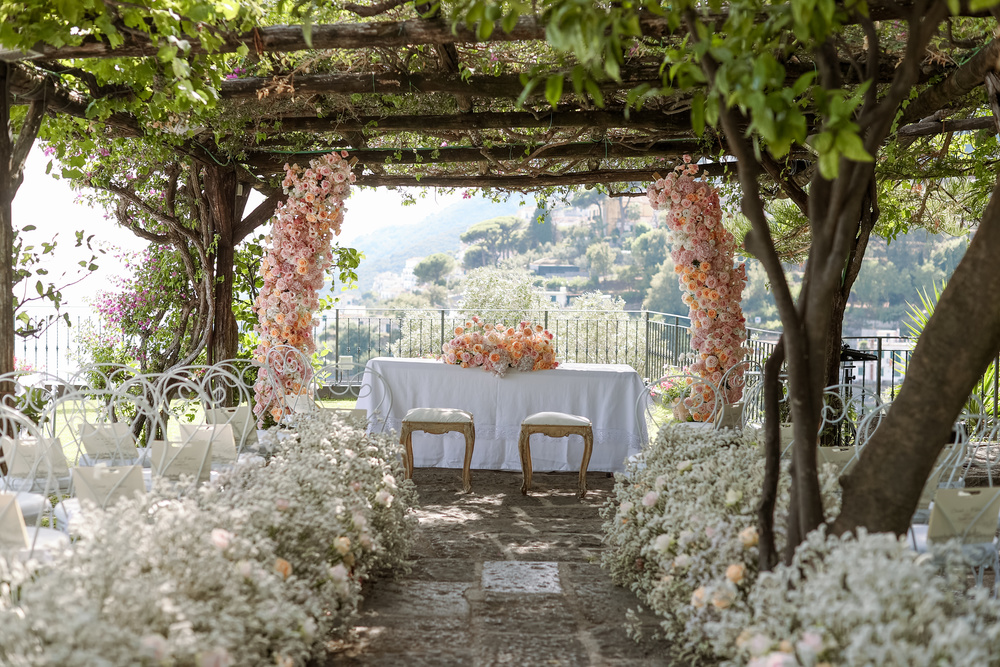 In Vietri sul Mare—where the Mediterranean blue meets the lemon glow and hand-painted tiles—this wedding set out to tell a love story with the same delicacy as its ceramics. A palette of ivory, blush and sea-blue guided the design, from garden roses and jasmine in the bouquet to stationery pieces created on small Vietri tiles, each one hand-lettered.