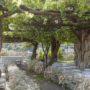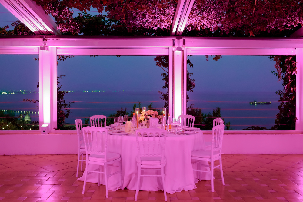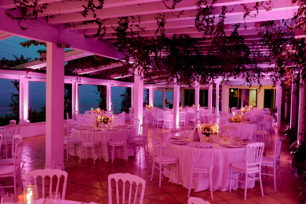 The sunset ceremony on a terrace overlooking the gulf balanced intimacy and panorama, framed by a light arch woven with olive branches and softly scented blooms. After the vows, guests moved to a garden strung with fairy lights. Tables dressed in natural linen featured artisan ceramic chargers, clear crystal and candles at varied heights. The menu celebrated the Amalfi Coast with fresh seafood, herbs and local citrus, while the cake—elegantly minimal, finished with edible flowers and thin lemon slices—closed dinner with quiet refinement.
