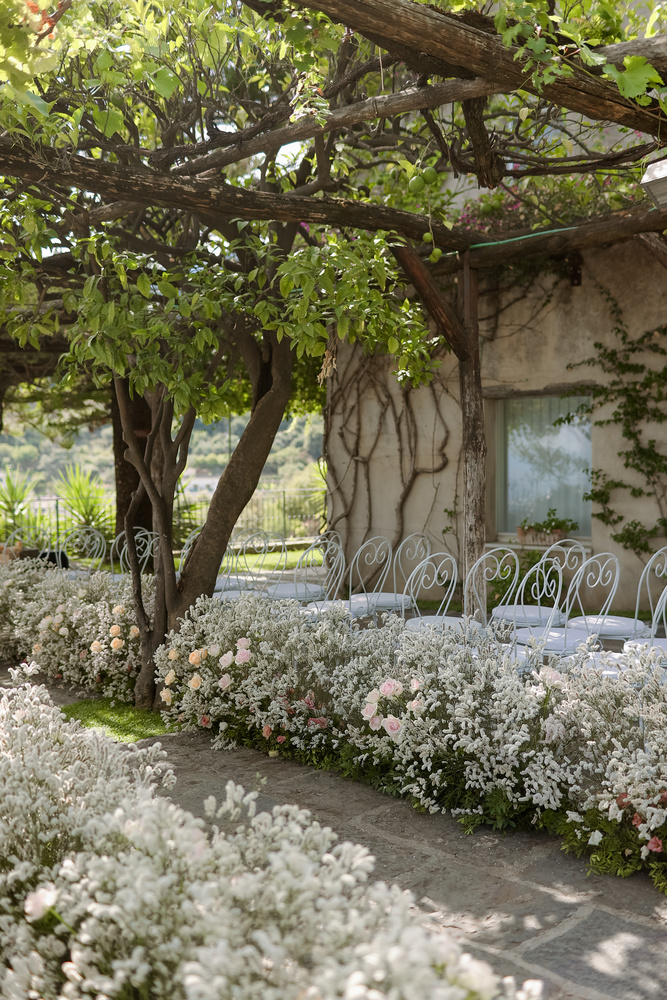 The couple’s look stayed effortless: a floaty, feminine gown for her with a veil that caught the evening breeze; for him, a tailored suit with clean lines. Music began acoustic and grew livelier as the night unfolded, and a limoncello and petite-patisserie corner invited everyone to toast to joy long after dinner.