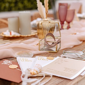 The mise en place of the reception on a wooden table with a romantic cake in perfect boho style.