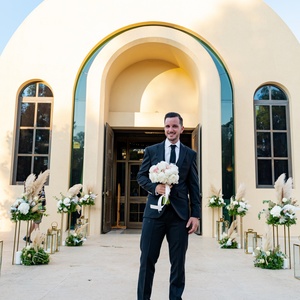 What really catches the eye is the breathtaking florals with white feathers, hydrangeas and pampas grass, combining the bohemian style with the elegance and grace