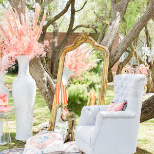 details, delightful salmon dotted floral arches and embellishments, set up a