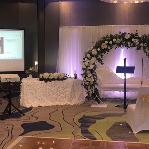 The ceremony area had a white curtain backdrop and the arch was covered in white roses, hydrangeas and greenery. The wedding was livestreamed on Facebook and the brides parents were zoomed in from Columbia.