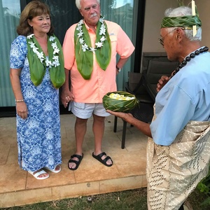 Krista and Roger from Arkansas have been married for almost 37 years and he had been to Kaua`i for business many years ago but without her, So juggling threw the CoVid travel changes they finally booked a vacation. Roger contacted Uncle Onio through a referral from Koloa Landing Resort. Onio secretly worked with him to plan the surprise. We showed up near their room, him with ukulele and me with my video camera as they were getting ready 'to go out to dinner'. They came out to beautiful music, gifts from Onio and a beautiful video.