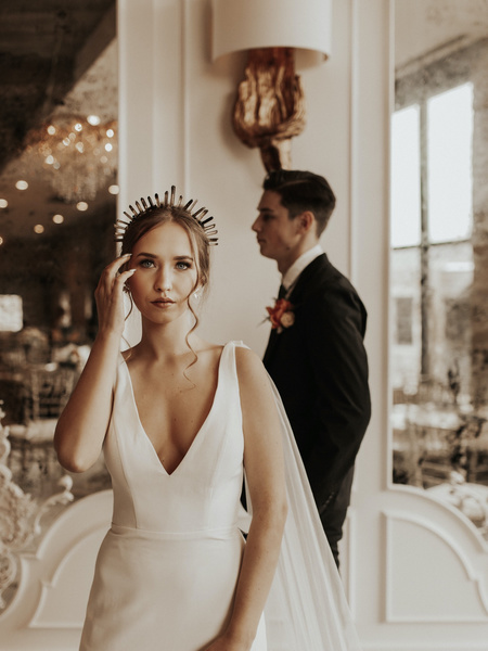 This Sleek And Modern Styled Wedding Shoot Combines Edgy With Traditional Wedding Vibes In The Most Perfect Way. The Bride's Gown 'ibiza' By Elavonza Bridal Gets Paired With Tulle Wings For Something Non-traditional, As Well As A Black Crystal Headpiece To Make A Statement. The Mood Was Dark Romantic, With Plenty Of Florals In Deep Warm Colours And An Invitation Suite That Will Have You Obsessed. Browse Through This Gallery To Get Tons Of Inspiration For A Modern, Sleek Wedding Styling Look!