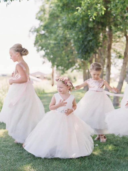 As A Color, Pink Is Very Delicate, Feminine, Romantic And Gentle. It Is Often Connected With Feelings Of Love And Joy. No Wonder It Is One Of The Women's Most Favorite Colors. Also, This Color Looks Great At Weddings, So It's Quite Understandable That Most Of The Brides Chooses It For Flowers, Decor, Bridesmaid Dresses, Flower Girl Dresses And Even Their Own Wedding Gowns. Pink Flower Girl Dresses Look Very Romantic, Cute And Festive. And Don't Get Us Started On How Much The Girls Like Them! These Dresses Blend Perfectly With Other Details Like Shoes, Flower Baskets And Hair Accessories. up To $60a Lot Of Future Brides Think That They Have To Spend A Large Sum Of Money For Flower Girl Dresses In Order For Them To Look Beautiful. Trust Us, That Is Far Away From Truth. On Our Website You Can Find Gorgeous Dresses For A Price Lower Than $50. Pink Dresses Are Perfect, Especially When Made From Quality Lace And Romantic And Playful Tulle. Do You Prefer A More Classic Style Of Dresses With Short Sleeves And Knee Length Or The Ones With Glitter And 3d Flowers? We're Sure That They Will All Look Equally Beautiful On Your Flower Girls.