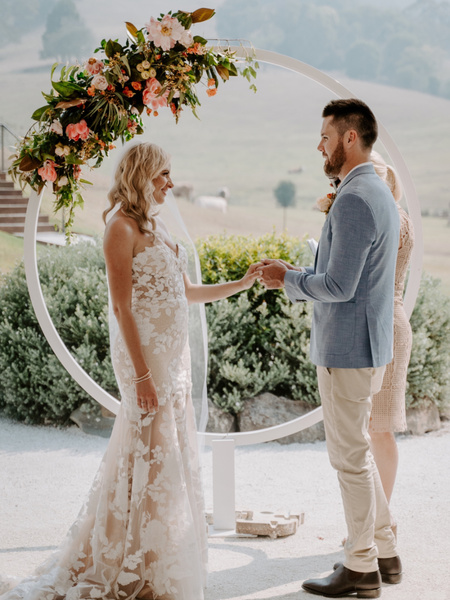 Haylie + Griff Tied The Knot During An Intimate Micro-wedding In The Hinterland Countryside Of Australia. Everything From Their Ceremony, To Their Small Reception Area, To Their Cocktail Hour Spot With Lawn Games And Breathtaking Views Was Absolute Perfection. If You're Taking Notes On How To Do A Small Wedding But Do It Beautiful, There Is A Lot You Can Learn From These Two! Haylie Wore The 'chloe' Gown By Goddess By Nature. #gbnbride